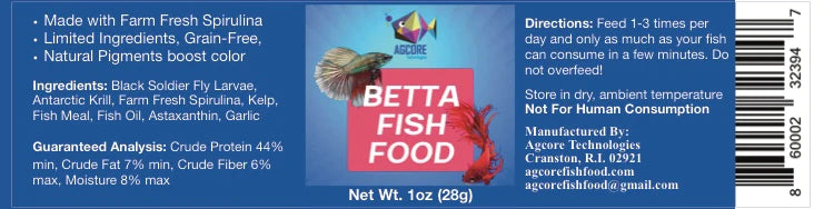 Agcore Betta Fish Food is nutritionally balanced and a great source of highly digestible protein. The natural pigments of the farm fresh Spirulina will provide natural color enhancement. Betta fish have very short digestive tracts and have difficulty with fillers such as corn, soy and wheat. Agcore Betta Fish Food is grain-free and no fillers!