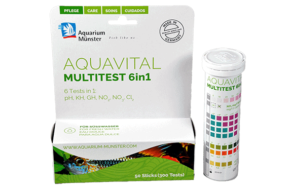 The AQUAVITAL MULTITEST 6in1 allows you to quickly, easily and reliably determine the 6 most important parameters for fresh water: pH, total hardness (GH), carbonate hardness (KH), nitrite (NO2), nitrate (NO3) and chlorine (Cl2).