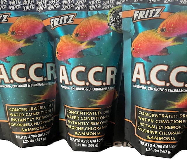 FritzPro A.C.C.R. is a unique, highly-concentrated powder that completely, instantly and safely detoxifies ammonia, chlorine and chloramine from fresh and saltwater. FritzPro A.C.C.R is non-toxic and can be safely used in all types of fish and aquatic invertebrate culture. Note: new packaging on this product